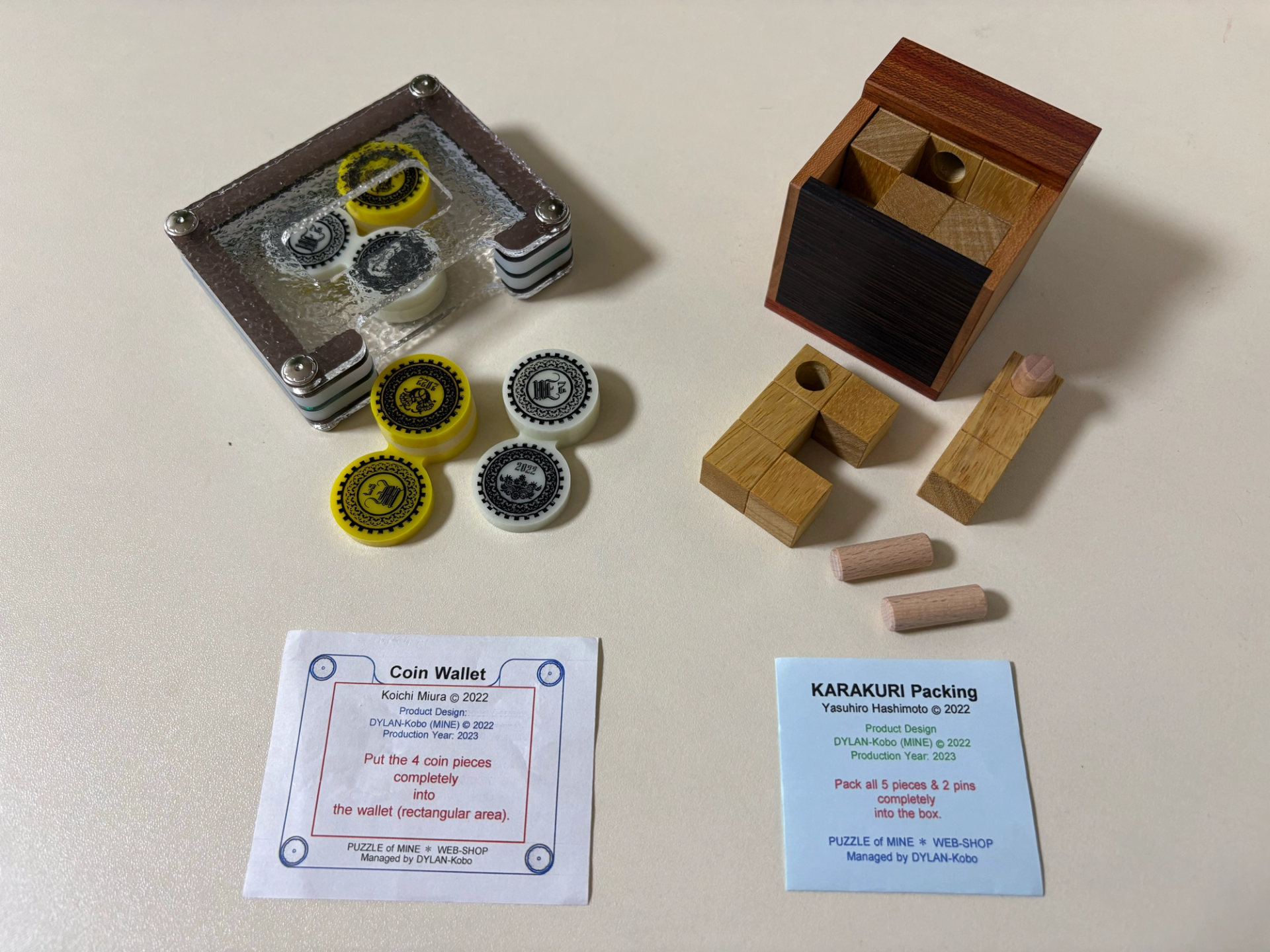 As soon as the Puzzle Party opened, I quickly scanned the booths and headed to MINE’s booth first. I really wanted Coin Wallet and Karakuri Packing, both winners of previous design competitions. Luckily enough, there was exactly one of each left, so I picked them up immediately.