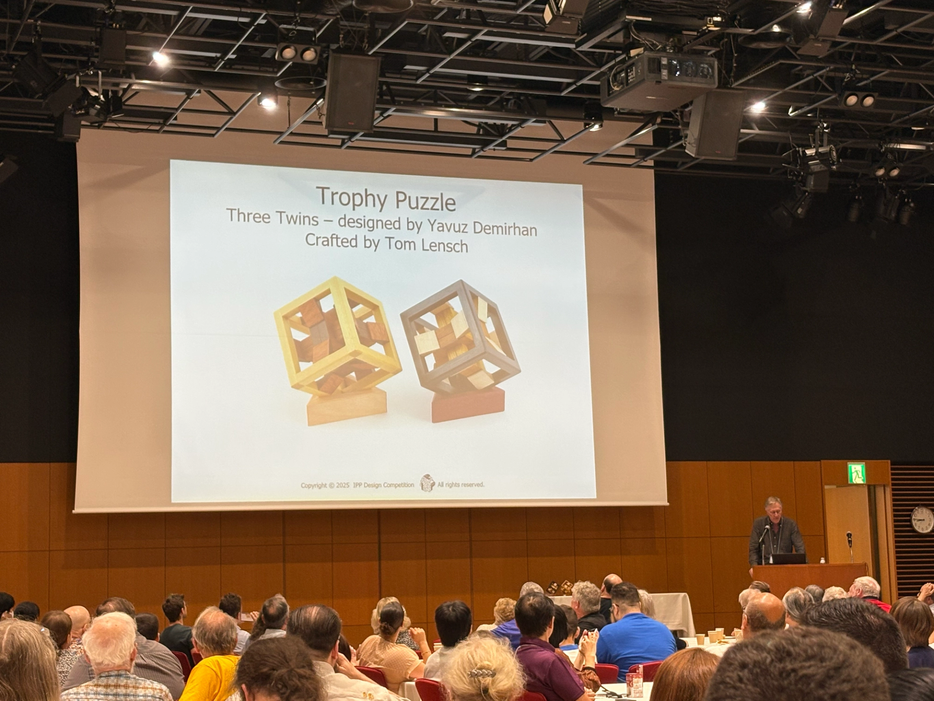 The design with the highest vote score wins the Puzzler’s Award. There are also jury-selcted awards: the Jury Grand/1st Prize and the Jury Honorable Mention. The winners receive a trophy, and even the trophy itself is a puzzle!