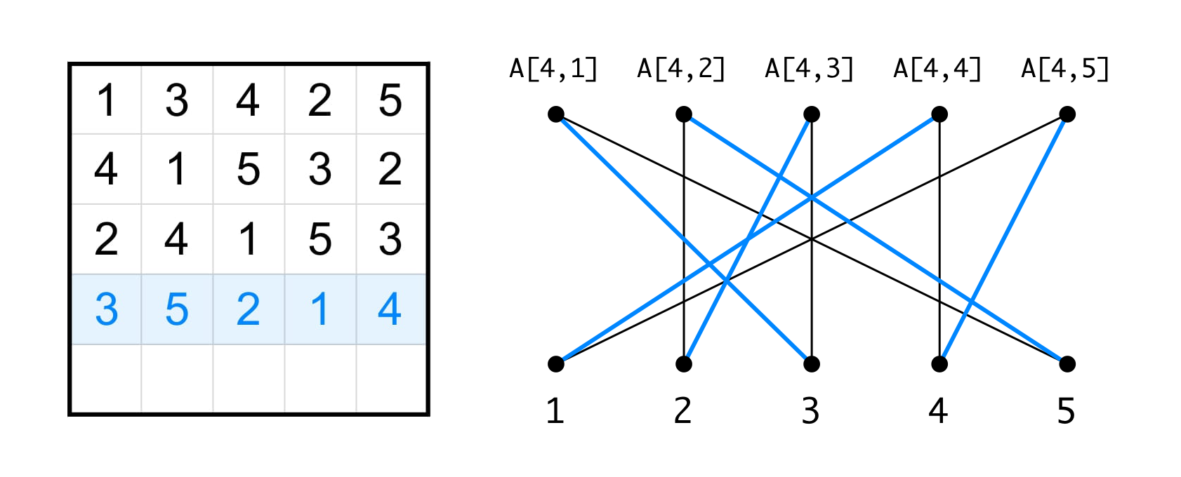 각 변수를 하나의 정점으로, 각 수를 또 다른 정점으로 만들어서 대응될 수 있는 변수와 값끼리 간선으로 이으면 이분 그래프가 만들어집니다. 변수마다 서로 다른 수를 배정해야 한다는 조건까지 더하면 이 그래프에서 완벽 이분 매칭 (Perfect Bipartite Matching)을 찾는 문제가 됩니다. 아래 그림은 라틴 직사각형과 이에 대응되는 이분 그래프, 그리고 행에 대응되는 이분 매칭을 나타낸 예시입니다.