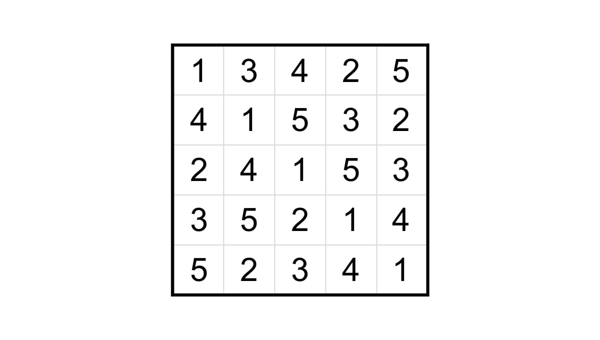라틴 방진 (Latin Square)은 서로 다른 가지 기호로 구성되며, 각 행과 열에 가지 기호가 모두 한 번씩 등장하게 만든 행렬입니다. 편의를 위해 가지 기호 대신 부터 까지의 수 배열이라고 생각합시다.