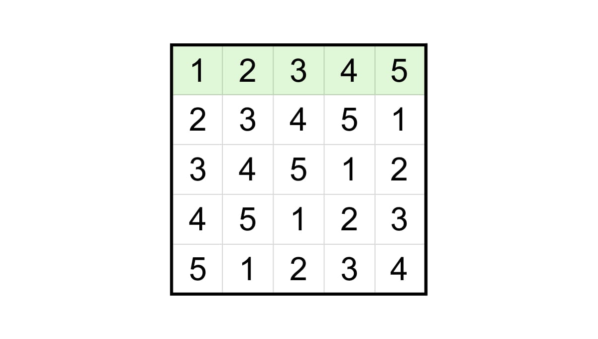 왼쪽으로 한 칸 회전한다는 것은 가장 왼쪽의 수를 가장 오른쪽으로 옮기는 것을 의미하며, 가령 첫 번째 행을 왼쪽으로 한 칸 회전하고 나면 이 됩니다. 회전을 반복해서 개의 행을 모두 채우면 다음 그림과 같은 라틴 방진이 만들어집니다.