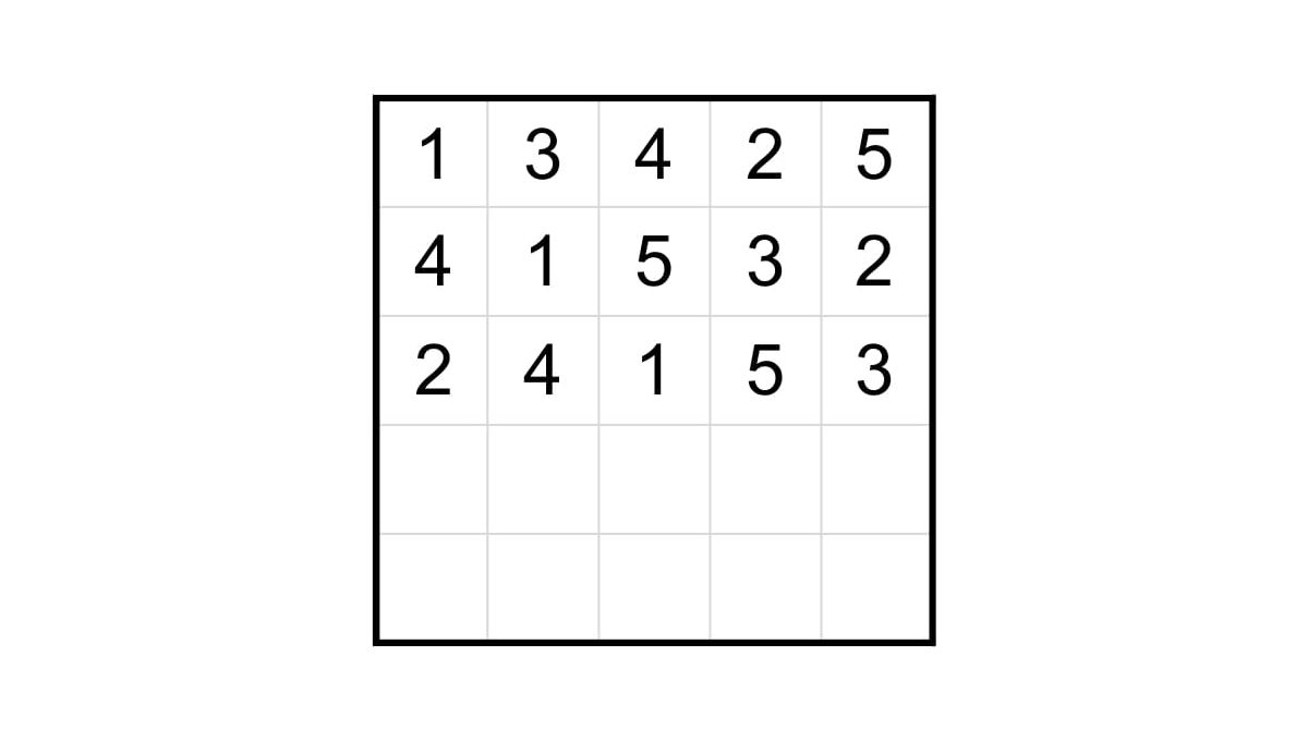 그렇다면 나머지 개의 행을 추가해서 라틴 방진을 만들 수 있을까요? 비록 직사각형이라는 정돈된 형태를 갖추고 있긴 하지만, 결국 개의 행은 아무렇게나 채운 것이기 때문에 왠지 라틴 방진을 완성하지 못하는 라틴 직사각형이 존재할 것 같습니다. 하지만 놀랍게도, 어떤 라틴 직사각형이 주어지든 항상 라틴 방진으로 확장하는 것이 가능합니다!