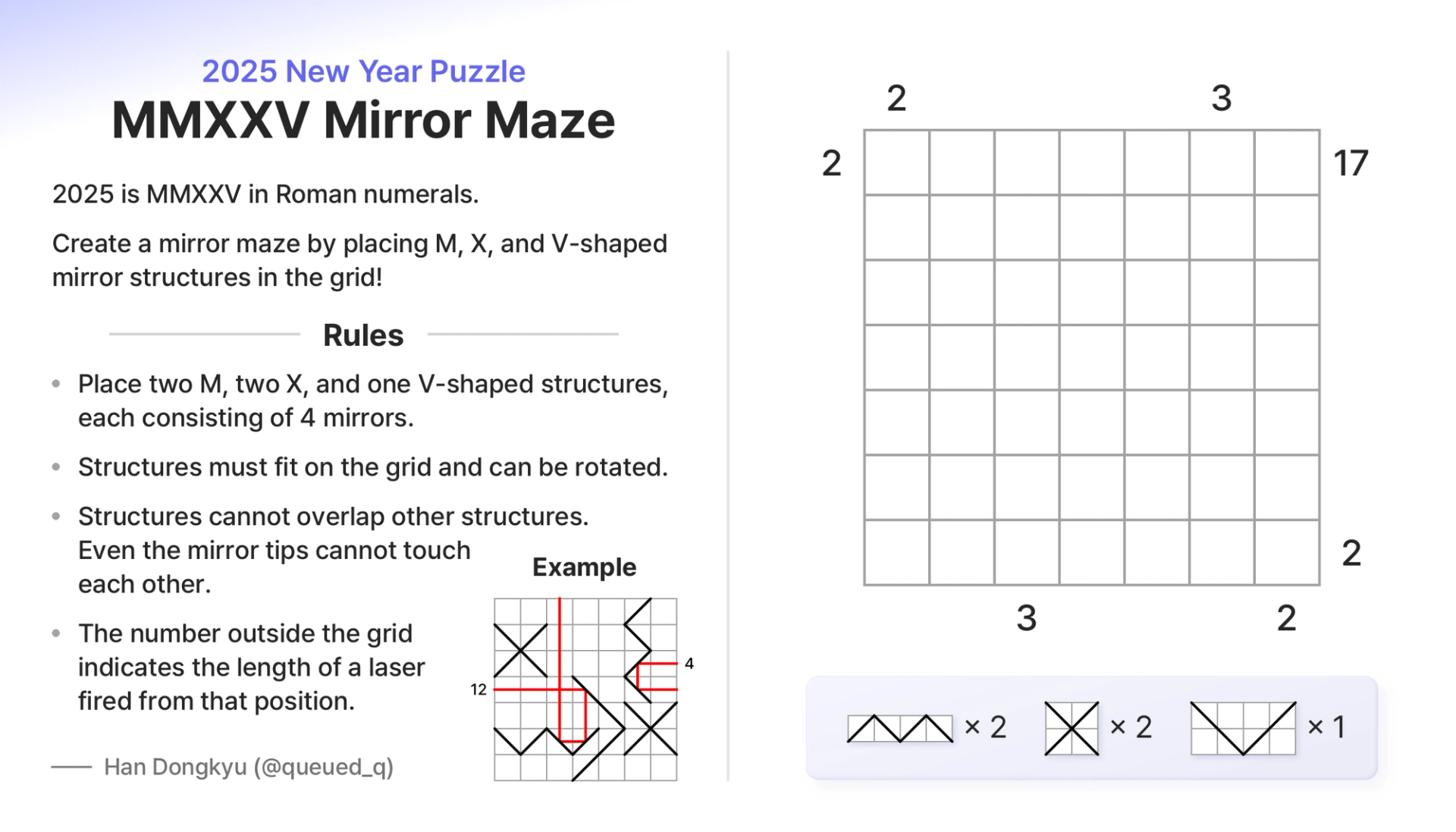 2025를 로마 숫자로 나타내면 MMXXV가 됩니다. 격자에 MMXXV 모양의 거울 구조물들을 설치해서, 격자 밖에서 쏜 레이저의 길이가 주어진 수들과 일치하도록 만들어 봅시다!