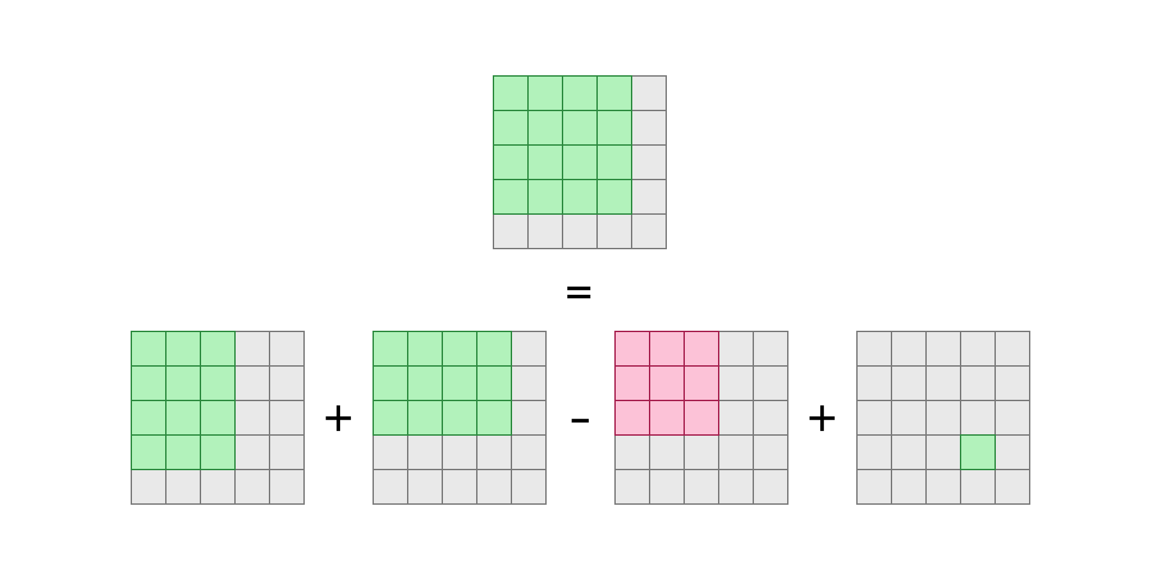 흔히 2차원 누적합을 다음과 같은 방식으로 계산합니다. 포함배제의 원리를 이용하여 이전 직사각형들의 합집합을 구하는 방식입니다.